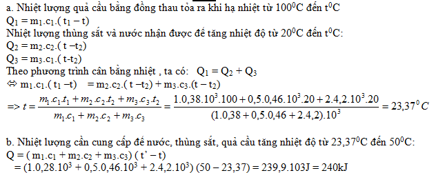 Bỏ một quả cầu bằng đồng thau có khối lượng 1kg được đun nóng đến 1000C vào thùng sắt có khối lượng 500g đựng 2kg nước ở 200C. Bỏ qua sự trao đổi nhiệt với môi trường.