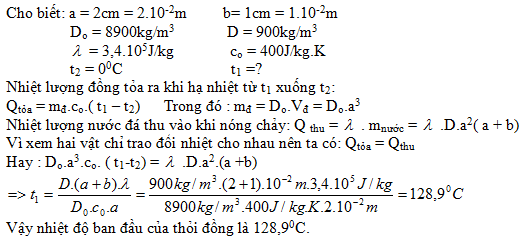 Để xác định nhiệt độ của một bếp lò người ta làm như sau; Bỏ vào lò một khối đồng hình lập phương có cạnh a = 2cm, sau đó lấy khối đồng bỏ trên một tảng nước đá ở 00C. Khi có cân bằng nhiệt, mặt trên của khối đồng chìm dưới mặt nước đá 1 đoạn b = 1cm. Biết khối lượng riêng của đồng là Do = 8900kg/m3, nhiệt dung riêng của đồng co = 400J/kg.k, nhiệt nóng chảy của nước đá = 3,4.105J/kg.K , khối lượng riêng của nước đá D = 900kg/m3. Giả sử nước đá chỉ tan có dạng hình hộp có tiết diện bàng tiết diện khối đồng.