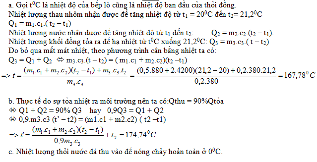 a/ Thả vào thau nước một thỏi đồng có khối lượng 200g lấy ở lò ra. Nước nóng đến 21,20C. Tìm nhiệt độ của bếp lò. Biết nhiệt dung riêng của nhôm, nước, đồng lần lượt là c1 = 800J/kg.K ; c2 = 4200J/kg.K ; c3 = 380J/kg.K, bỏ qua sự trao đổi nhiệt ra môi trường.