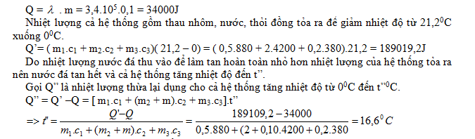 c/ Nếu tiếp tục bỏ vào thau nước một cục nước đá có khối lượng 100g ở 00C. Nước đá tan hết không? Tìm nhiệt độ cuối cùng của hệ thống hoặc lượng nước đá còn sót lại nếu nó không tan hết. Biết nhiệt nóng chảy của nước đá là = 3,4.105J/kg.
