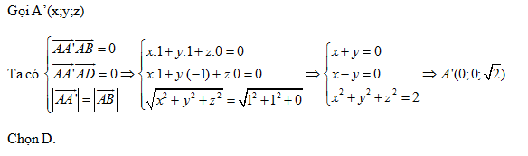 Trong không gian Oxyz cho hình lập phương ABCD.A’B’C’D’, có đỉnh A trùng với gốc tọa độ, đỉnh B(1;1;0) D(1;-1;0). Tìm tọa độ A’ biết A’ có cao độ dương.