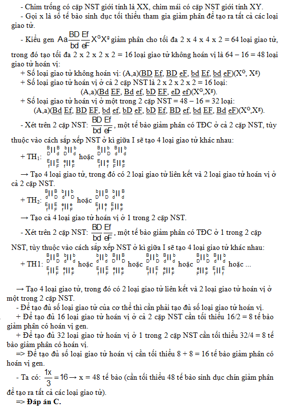 giảm phân hình thành giao tử. Biết rằng quá trình giảm phân diễn ra bình thường và có 1/3 tế bào giảm phân có hoán vị gen. Theo lí thuyết, số lượng tế bào sinh dục chín tối thiểu tham gia giảm phân để tạo ra tất cả các loại giao tử từ cơ thể có kiểu gen trên là