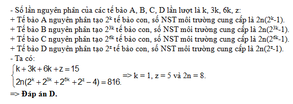 Bốn tế bào A, B, C, D đều thực hiện quá trình nguyên phân. Tế bào B có số lần nguyên phân gấp 3 lần so với tế bào A và chỉ bằng 1/2 số lần nguyên phân của tế bào C. Tổng số lần nguyên phân của cả 4 tế bào là 15. Nếu quá trình trên cần được cung cấp 816 nhiễm sắc thể đơn cho cả 4 tế bào nguyên phân thì số nhiễm sắc thể trong bộ lưỡng bội của loài bằng