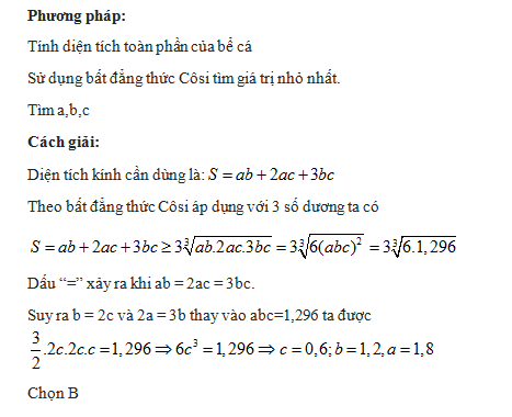 Một người thợ cần làm một bể cá hai ngăn , không có nắp ở phía trên với thể tích 1,296 m3. Người thợ này cắt các tấm kính ghép lại một bể cá dạng hình hộp chữ nhật với 3 kích thước a,b,c như hình vẽ. Hỏi người thợ phải thiết kế các kích thước a,b,c bằng bao nhiêu để đỡ tốn kính nhất, giả sử độ dày của kính không đáng kể.