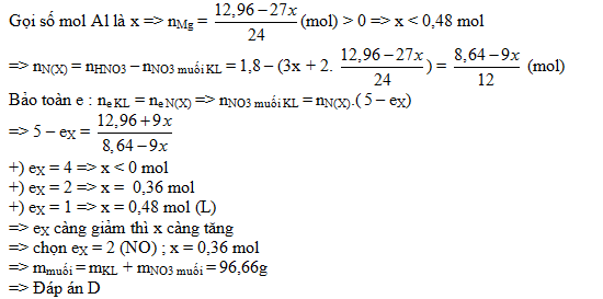 Cho 12,96 gam hỗn hợp Al và Mg tác dụng vừa đủ với dung dịch chứa 1,8 mol HNO3 tạo ra sản phẩm khử X duy nhất. Làm bay hơi dung dịch sau phản ứng thu được m gam muối khan, m là?