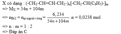 Polime X được tạo ra do phản ứng đồng trùng hợp giữa but-1,3-dien và stiren. Biết 6,234 g X phản