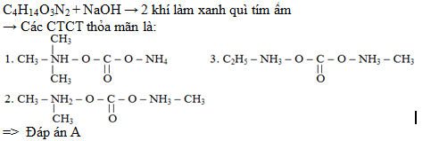 X có công thức C4H14O3N2. Khi cho X tác dụng với dung dịch NaOH thì thu được hỗn hợp Y gồm 2 khí ở điều kiện thường và đều có khả năng làm xanh quì tím ẩm. Số công thức cấu tạo phù hợp của X là