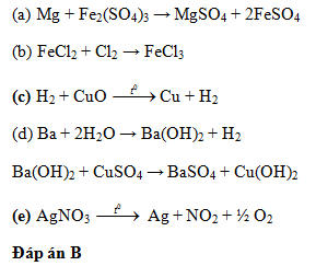 Tiến hành các thí nghiệm sau: (a) Cho Mg vào dung dịch Fe2(SO4)3 dư; (b) Sục khí Cl2 vào dung dịch FeCl2 ; (c) Dẫn khí H2 dư qua bột CuO đun nóng; (d) Cho Ba vào dung dịch CuSO4 dư; (e) Nhiệt phân AgNO3. Sau khi kết thúc các phản ứng, số thí nghiệm thu được kim loại là
