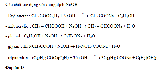 Cho các chất: etyl axetat, anilin, axit acrylic, phenol, glyxin, tripanmitin. Trong các chất này, số chất tác dụng được với dung dịch NaOH là
