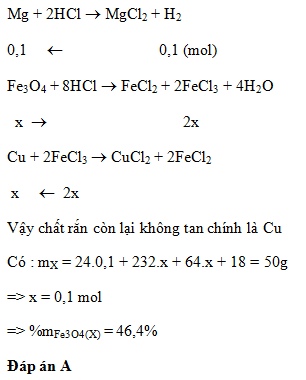 Cho 50 gam hỗn hợp X gồm Fe3O4, Cu , Mg tác dụng với dung dịch HCl dư, sau phản ứng được 2,24 lít H2 (đktc) và còn lại 18 gam chất rắn không tan. Phần trăm khối lượng Fe3O4 trong X là