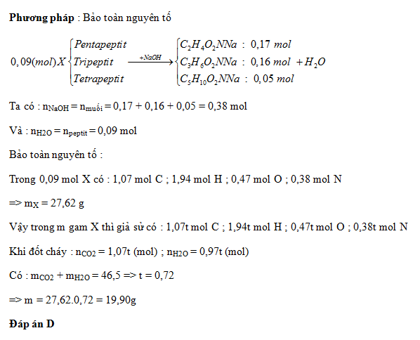Thủy phân hoàn toàn 0,09 mol hỗn hợp X gồm tripeptit, tetapeptit, pentapeptit với dung dịch NaOH vừa đủ thu được 16,49 gam muối của Glyxin; 17,76 gam muối của Alanin và 6,95 gam muối của Valin. Nếu đốt cháy hoàn toàn m gam hỗn hợp X thì thu được CO2, H2O và N2 trong đó tổng khối lượng của CO2 và H2O là 46,5 gam. Giá trị gần nhất của m là