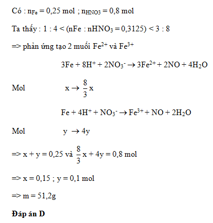Hoà tan hoàn toàn 14,0 gam Fe trong 400ml dung dịch HNO3 2M, thu được dung dịch X chứa m gam muối và khí NO (là sản phẩm khử duy nhất). Giá trị của m là