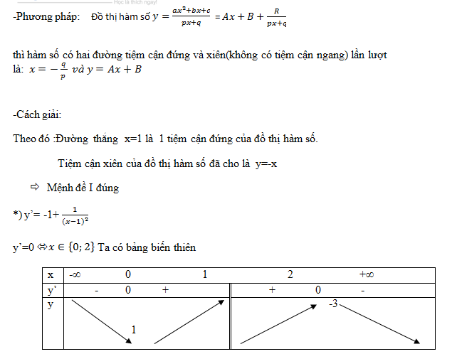 (I) Đồ thị của hàm số có tiệm cận đứng x = 1 và y = -x (II) yCD = y(2) = -3, yCT = y(0) =