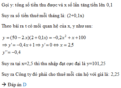 Một công ty bất động sản có 50 căn hộ cho thuê. Biết rằng nếu cho thuê mỗi căn hộ với giá 2.000.000 đồng một tháng thì mọi căn hộ đều có người thuê và cứ tăng thêm giá cho thuê mỗi căn hộ 100.000 đồng một tháng thì sẽ có 2 căn hộ bị bỏ trống. Hỏi muốn có thu nhập cao nhất thì công ty đó phải cho thuê mỗi căn hộ với giá bao nhiêu một tháng.