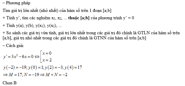 Gọi M, N lần lượt là giá trị lớn nhất và giá trị nhỏ nhất của hàm số y = x3 – 3x2 + 1 trên đoạn [-2;4]. Tính tổng M + N.