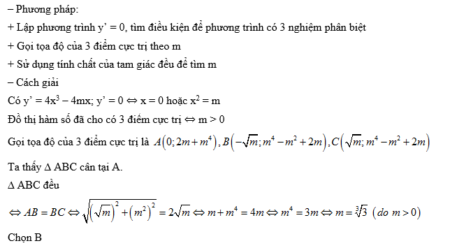 Tìm tất cả các giá trị của tham số m sao cho đồ thị hàm số y = x4 – 2mx2 + 2m + m4 có ba điểm cực trị tạo thành một tam giác đều.