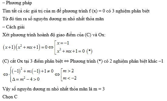 Cho hàm số y = (x + 1)(x2 + mx + 1) có đồ thị (C). Tìm số nguyên dương nhỏ nhất m để đồ thị (C) cắt trục hoành tại ba điểm phân biệt