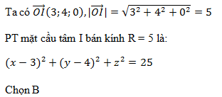Trong không gian với hệ tọa độ Oxyz. Mặt cầu (S) tâm I(3;4;0) và đt qua gốc O có phương