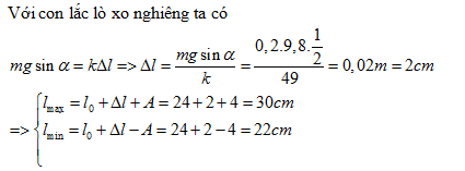 Một con lắc gồm một quả cầu nhỏ khối lượng m=200g và một lò xo lý tưởng có độ dài tự nhiên l0 =24cm, độ cứng k = 49N/m. Cho quả cầu dao động điều hòa với biên độ 4cm xung quanh vị trí cân bằng trên đường dốc chính của một mặt phẳng nghiêng(góc nghiêng α = 300 so với mặt phẳng ngang).Lấy g = 9,8m/s2, bỏ qua mọi ma sát.Khi vật dao động thì chiều dài lò xo thay đổi trong phạm vi