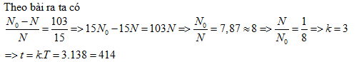 Ban đầu có một mẫu 21084Po nguyên chất. Hạt nhân này phân rã α chuyển thành đồng vị bền X với chu kì bán rã 138 ngày. Ở thời điểm khảo sát, tỉ lệ số hạt chất X và Po trong mẫu là 103:15. Tuổi của mẫu chất là