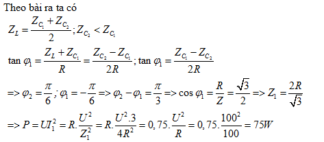 Đặt điện áp u=100√2cos100πt(V) vào hai đầu đoạn mạch mắc nối tiếp gồm điện trở thuần R=100 Ω, cuộn cảm thuần L và tụ điện C thay đổi được.Khi thay đổi điện dung tụ điện đến C1 và C2> C1 thì công suất tiêu thụ trong mạch cùng bằng P nhưng cường độ dòng điện tức thời trong hai trường hợp lệch pha nhau π/3. Giá trị của P bằng