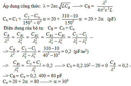 Mạch chọn sóng của một máy thu vô tuyến gồm cuộn cảm thuần L và một bộ tụ gồm tụ C0 ghép song song với tụ xoay CX có điên dung biến thiên từ C1 =10pF. Đến C2 = 310pF khi góc xoay biến thiên từ 00 đến 1500 . Mạch thu được sóng điện từ có bước sóng từ λ1 =10m đến λ2 =40m . Biết điện dung của tụ xoay là hàm bậc nhất của góc xoay. Để mạch thu sóng điện từ có bước sóng λ = 20m thì góc xoay của bản tụ là