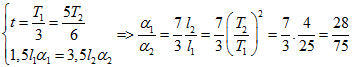 Tại một nơi trên mặt đất, có hai con lắc đơn dao động điều hòa với biên độ góc a1, a2 và chu kì tương ứng T1, T2 = 5/2T1. Ban đầu cả hai con lắc đều ở vị trí biên. Sau thời gian T1 /3 đầu tiên, quãng đường mà vật nhỏ của hai con lắc đi được bằng nhau. Tỉ số