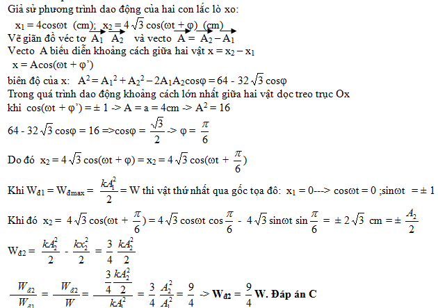 cm, con lắc thứ hai dao động sớm pha hơn con lắc thứ nhất. Trong quá trình dao động khoảng cách lớn nhất giữa hai vật dọc treo trục Ox là a = 4cm. Khi động năng của con lắc thứ nhất cực đại là W thì động năng của con lắc thứ hai là: