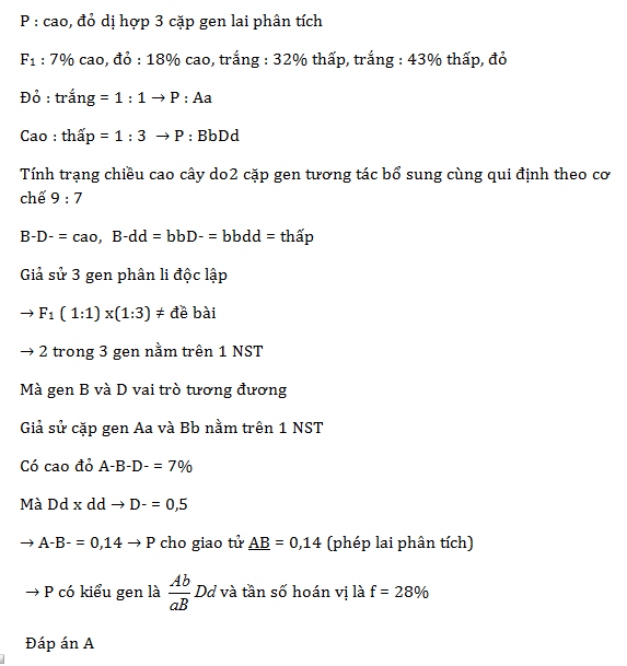 Cây lanh Linum usitatissimum là giống cây lấy sợi phổ biến ở các nước châu Á, locus chi phối màu sắc hoa có 2 alen trong đó A quy định hoa đỏ là trội hoàn toàn so với a quy định hoa trắng. Hai locus khác mỗi locus 2 alen là B/b và D/d cùng chi phối chiều cao cây. Tiến hành phép lai phân tích cây dị hợp 3 locus có kiểu hình thân cao, hoa đỏ được đời con 141 cây thân cao, hoa đỏ: 361 thân cao, hoa trắng: 640 thân thấp, hoa trắng: 861 thân thấp, hoa đỏ. Kiểu gen của cây đem lai phân tích là: