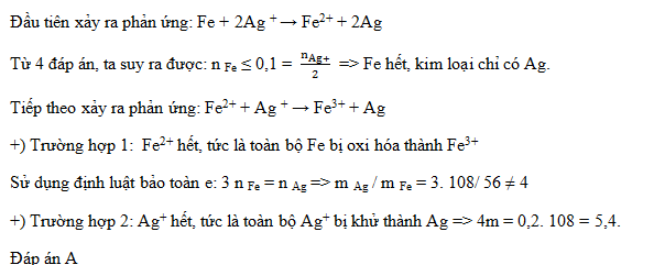 Cho m gam Fe vào dung dịch chứa 0,2 mol AgNO3 và 0,1 mol Cu(NO3)2. Sau khi các phản ứng xảy ra hoàn toàn, thu được 4m gam kim loại. Giá trị của m là: