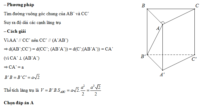 Cho lăng trụ đứng ABC.A’B’C’ có đáy là tam giác vuông cân đỉnh A, mặt bên BCC’B’ là hình vuông, khoảng cách giữa AB’ và CC’ bằng a. Thể tích khối lăng trụ ABC.A’B’C’ là