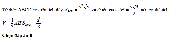 Cho tứ diện ABCD có 2 mặt ABC, BCD là tam giác đều cạnh a và nằm trong các mặt phẳng vuông góc với nhau. Thể tích của khối tứ diện ABCD là