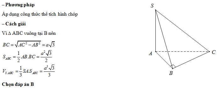 Cho hình chóp S.ABC có đáy là tam giác vuông tại cạnh B, cạnh SA vuông góc với đáy và AB = a, SA = AC = 2a. Thể tích của khối chóp S.ABC là: