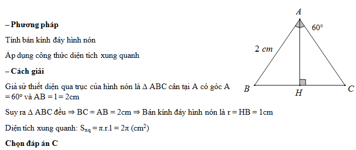 Cho hình nón có độ dài đường kính bằng 2cm, góc ở đỉnh bằng . Diện tích xung quanh hình