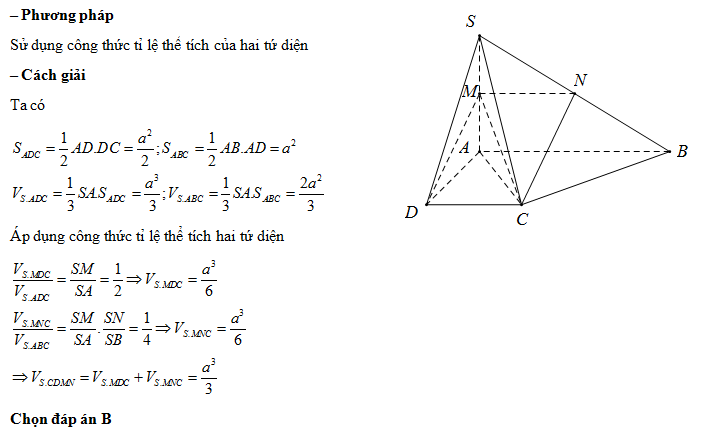 Cho một hình chóp S.ABCD có đáy là hình thang vuông tại A và D, AB=2a, AD=DC=a, cạnh bên SA vuông góc với đáy và SA = 2a. Gọi M,N là trung điểm của SA và SB. Thể tích của khối chóp S.CDMN là