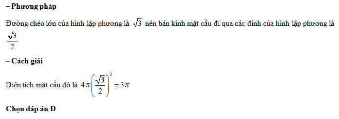Cho hình lập phương có các cạnh bằng 1. Diện tích bề mặt cầu đi qua các đỉnh của một hình lập phương là: