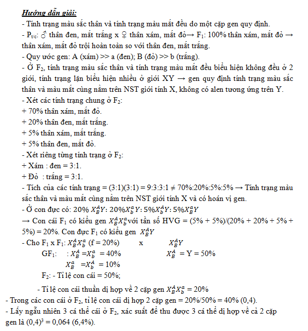 Ở một loài động vật, tính trạng màu sắc thân và tính trạng màu mắt đều do một cặp gen quy định. Cho con đực (XY) thân đen, mắt trắng thuần chủng lai với con cái thân xám, mắt đỏ thuần chủng được F1 đồng loạt thân xám, mắt đỏ. Cho F1 giao phối ngẫu nhiên với nhau, đời F2 có 50% con cái thân xám, mắt đỏ; 20% con đực thân xám, mắt đỏ; 20% con đực thân đen, mắt trắng; 5% con đực thân xám, mắt trắng; 5% con đực thân đen, mắt đỏ. Lấy ngẫu nhiên 3 cá thể cái ở F2, xác suất để thu được 3 cá thể dị hợp về cả 2 cặp gen là bao nhiêu?