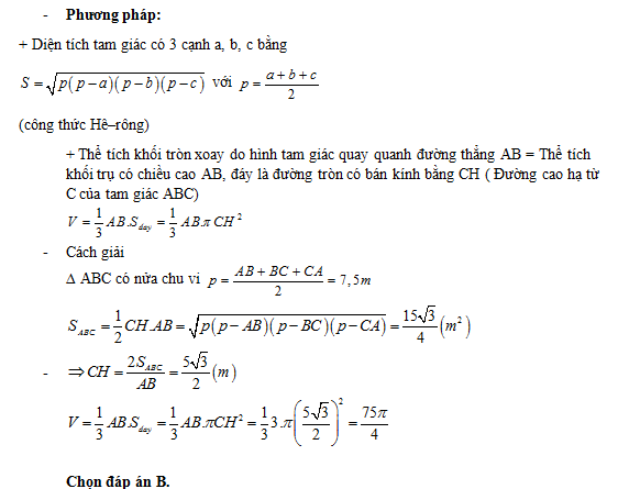 Cho tam giác ABC có AB ,BC, CA lần lượt bằng 3, 5, 7 . Tính thể tích của khối tròn xoay sinh ra do hình tam giác ABC quay quanh đường thẳng AB.