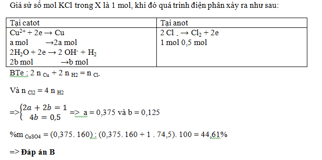 Hòa tan hoàn toàn hỗn hợp X gồm CuSO4 và KCl vào H2O, thu được dung dịch Y. Điện phân Y (có màng ngăn, điện cực trơ) đến khi H2O bắt đầu điện phân ở cả hai điện cực thì dừng điện phân. Số mol khí thoát ra ở anot bằng 4 lần số mol khí thoát ra từ catot. Phần trăm khối lượng của CuSO4 trong X là