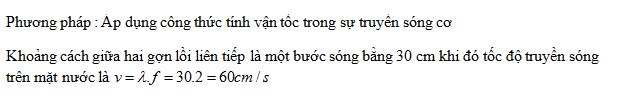 Tại một điểm O trên mặt nước yên tĩnh có nguồn dao động điều hòa theo phuwowg trình thẳng đứng với tần số f = 2Hz. Từ điểm O có những gợn sóng tròn lan truyền rộng rẫ xung quanh. Khoảng cách giữa hai gợn sóng liên tiếp là 30 cm. Tốc độ truyền sóng trên mặt nước là