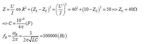 Đặt điện áp xoay chiều có giá trị hiệu dụng 2 V và tần số 50 kHz vào hai đầu đoạn mạch gồm điện trở có giá trị 40 Ω, cuộn cảm thuần có độ tự cảm 1/10π mH và tụ điện có điện dung C mắc nối tiếp thì cường độ dòng điện hiệu dụng trong đoạn mạch là 40 mA. Nếu mắc cuộn cảm và tụ điện trên thành mạch dao động LC thì tần số dao động riêng của mạch bằng