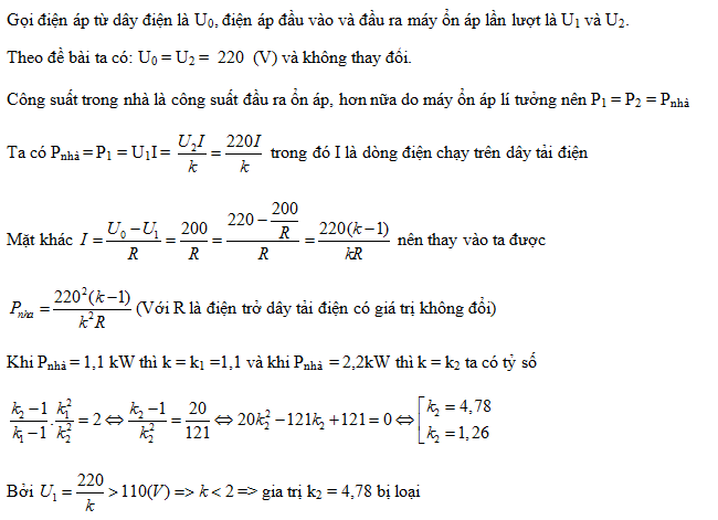 Điện năng được truyền từ đường dây điện một pha có điện áp hiệu dụng ổn định 220 V vào nhà một hộ dân bằng đường dây tải điện có chất lượng kém. Trong nhà của hộ dân này, dùng một máy biến áp lí tưởng để duy trì điện áp hiệu dụng ở đầu ra luôn là 220 V (gọi là máy ổn áp). Máy ổn áp này chỉ hoạt động khi điện áp hiệu dụng ở đầu vào lớn hơn 110 V. Tính toán cho thấy, nếu công suất sử dụng điện trong nhà là 1,1 kW thì tỉ số giữa điện áp hiệu dụng ở đầu ra và điện áp hiệu dụng ở đầu vào (tỉ số tăng áp) của máy ổn áp là 1,1. Coi điện áp và cường độ dòng điện luôn cùng pha. Nếu công suất sử dụng điện trong nhà là 2,2 kW thì tỉ số tăng áp của máy ổn áp bằng