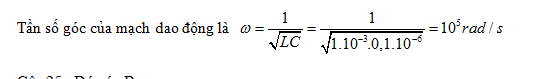 Mạch dao động điện từ LC lí tưởng gồm cuộn cảm thuần có độ tự cảm L = 1 mH và tụ điện có điện dung C = 0,1 mF. Dao động điện từ riêng của mạch có tần số góc
