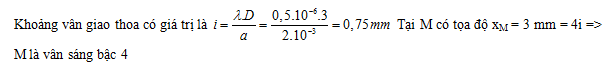 Trong thí nghiệm Iâng về giao thoa ánh sáng : khoảng cách hai khe S1S là 2 mm , khoảng cách từ S1S2 đến màn là 3 m ,bước sóng ánh sáng là 0,5 µm. Tại M có toạ độ xM =3 mm là vị trí