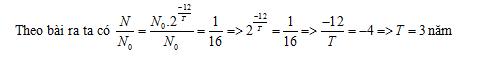 Một lượng chất phóng xạ sau 12 năm thì còn lại 1/16 khối lượng ban đầu của nó. Chu kì bán