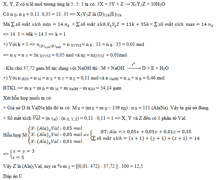 X, Y, Z là ba peptit mạch hở, được tạo từ Ala, Val. Khi đốt cháy X, Y với số mol bằng nhau thì đều được lượng CO2 là như nhau. Đun nóng 37,72 gam hỗn hợp M gồm X, Y, Z với tỉ lệ mol ương ứng là 5 : 5 : 1 trong dung dịch NaOH, thu được dung dịch T chứa 2 muối D, E với số mol lần lượt là 0,11 mol và 0,35 mol. Biết tổng số mắt xích của X, Y, Z bằng 14. Phần trăm khối lượng của Z trong M gần nhất với ?