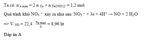 Cho 0,3 mol bột Cu và 0,6 mol Fe(NO3)2 vào dung dịch chứa 0,9 mol H2SO4 (loãng). Sau khi các phản ứng xảy ra hoàn toàn, thu được V lít khí NO (sản phẩm khử duy nhất ở đktc). Giá trị của V là: