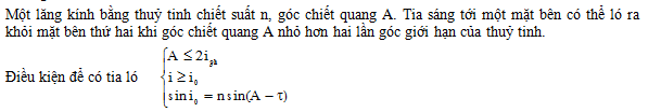 Một lăng kính bằng thuỷ tinh chiết suất n, góc chiết quang A. Tia sáng tới một mặt bên có thể ló ra khỏi mặt bên thứ hai khi