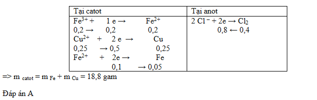 Điện phân 500ml dung dịch gồm FeCl3 0,4M và CuCl2 0,5M ở điện cực trơ. Khi ở anot thoát ra 8,96