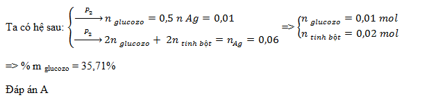 Hỗn hợp A gồm glucozo và tinh bột. Chia hỗn hợp thành hai phần bằng nhau. Phần thứ nhất khuấy trong nước, lọc lấy dung dịch cho tác dụng với lượng dư dung dịch AgNO3 trong NH3 thu được 2,16 gam Ag. Phần thứ hai được đun nóng với dung dịch H2SO4 loãng. Hỗn hợp sau phản ứng được trung hòa bởi dung dịch NaOH, sau đó cho toàn bộ sản phẩm tác dụng với lượng dư dung dịch AgNO3 trong NH3, thu được 6,48 gam Ag. Phần trăm khối lượng glucozo trong hỗn hợp A là: